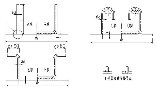 (3). 爪形埋件中A、B两型锚筋宜采用螺纹钢。C、D型的锚筋在设计时应考虑锚筋间的干涉及锚筋在安装时与结构配筋之间的干涉问题。E、F型埋件适合于需要进行防雷的部位。